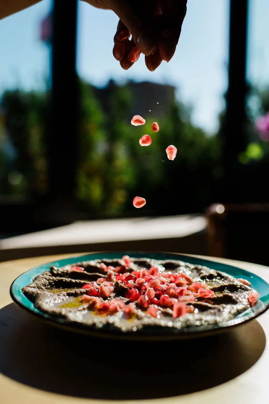 A Syrian marriage of spicy and sweet. Aleppo Pepper,pomegranate,walnuts, toasted pita, red roasted peppers