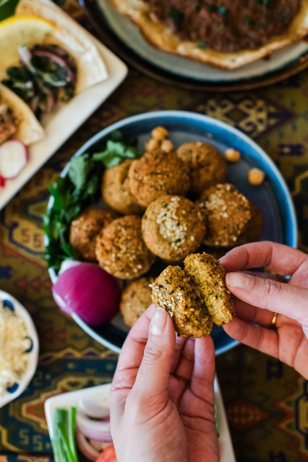 Traditional fried chickpea patties Tahini, sumac onions, Syrian pickles, Persian cucumbers, housemade lifits